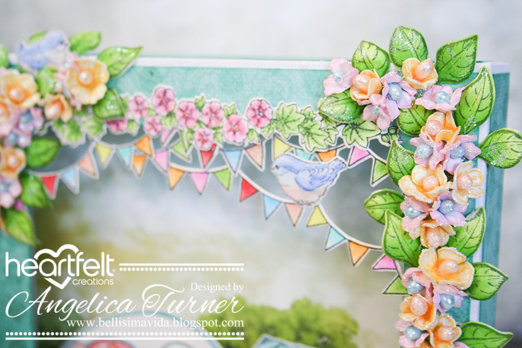 Glue banner flags, flower border to front of shadow box, create an arrangement with the flowers and leaves on either side of the banners as pictured.  Glue 2 little birds as pictured.  Add a touch of glitter to flowers.