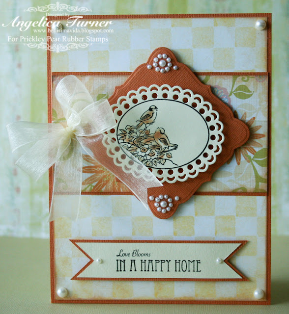 Hi everyone, hope you all had a great weekend. It's Monday and time to share some Prickley Pear Rubber Stamps inspiration with you. Today I have this card I based on a great sketch over at "The Deconstructed Sketch". I started by cutting the scalloped oval from cream cardstock and stamped the birdie image from the "Scalloped Oval" clear stamp set with black ink.
